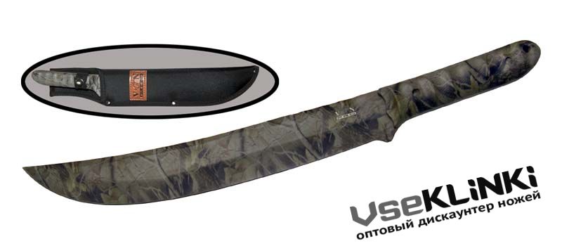 Общая длина 382 мм, длина клинка 262 мм, сталь 440, рукоять-пластик, ножны-кордура