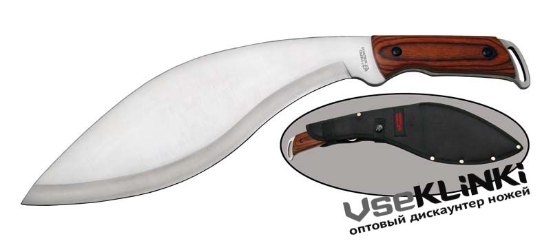 Общая длина 435мм, длина клинка 320мм, сталь 420, сатинирование, рукоять-дерево, ножны-кордура.