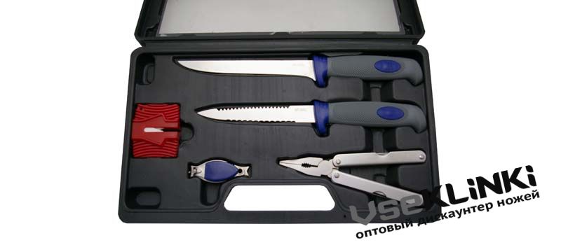 Набор из 2-х ножей, мультиинструмента, точилки и кусачек. Общая длина 274/250 мм, длина клинка 154/128 мм, сталь 420, сатинирование, рукоять-пластик.