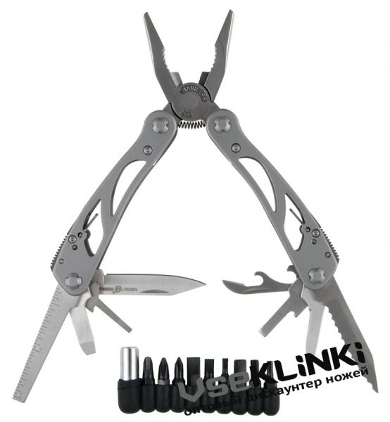 Общая длина 165 мм, длина клинка 60 мм, сталь 420, рукоять-металл, количество лезвий: 8+10 насадок.