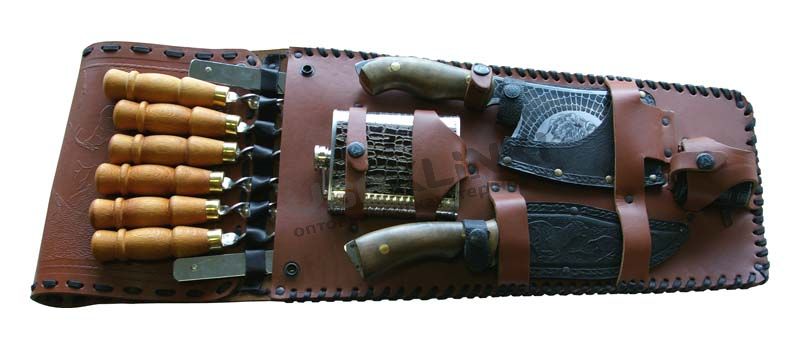 Комплектность: Нож нескладной - общая длина 280 мм, длина клинка 152 мм, рцкоять дерево, ножны: кожа + Топор -общая длина 265 мм, обух дерево + Шампура - 6шт +Мангал складной +Стакан металл 4шт + фляга металл