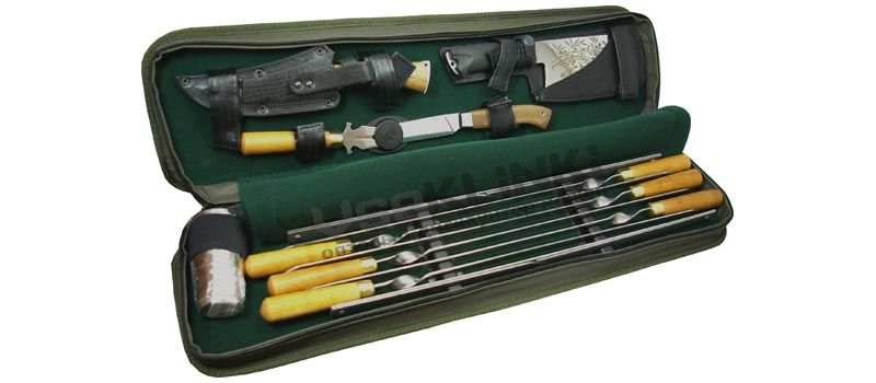 Комплектность: Шампура - 6 шт, Вилка для снятия мяса с шампура - 1 шт, Мангал складной (нерж) - 1 шт, Нож нескладной - 1 шт (общая длина 280, длина клинка 151, сталь 65Х13, рукоять-дерево), Топор - 1 шт (общая длина 303, длина клинка 185, сталь 65Х13, рукоять-дерево, ножны-кожа), Стаканчики (нерж) - 6 шт, Нож - 1 шт (общая длина 257, длина клинка 137, сталь 65Х13, рукоять-дерево, ножны-кожа)