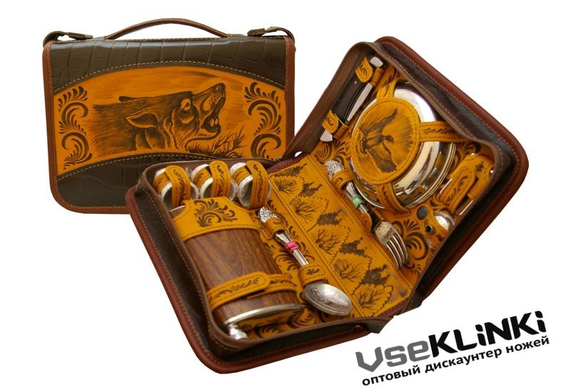 Комплектность: Нож складной общая длина 225 мм длина клинка 100 мм, Ложки - 3 шт, Вилки - 3шт, Стопки - 3шт, Тарелки - 3 шт, Фляжка, Зажигалка Zippo, Воронка