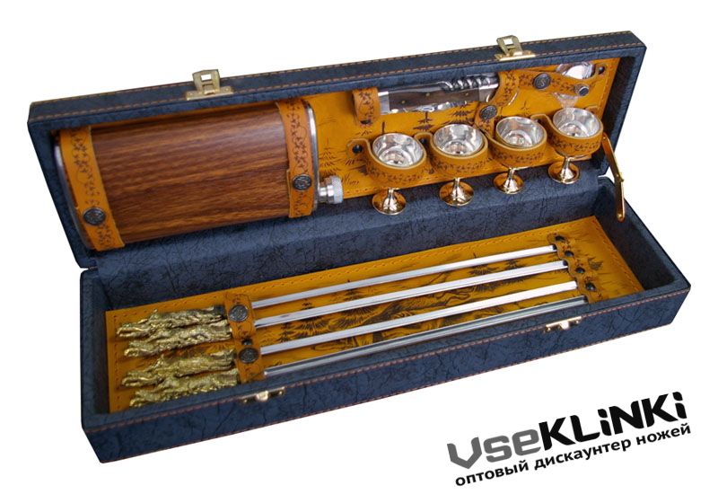 Комплектность: Нож складной общая длина 225 мм длина клинка 100 мм, Стопки - 4 шт, Шампура - 4 шт, Фляжка (0,5), Воронка
