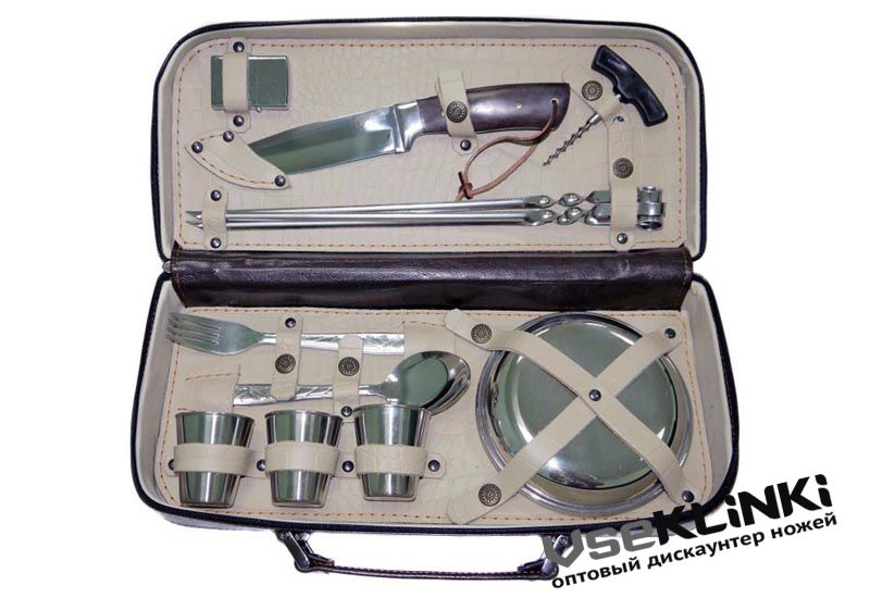 Комплектность: Нож нескладной общая длина 252 мм длина клинка 136 мм толщина клинка (max): 2,3 мм, Вилка - 3 шт, Ложка - 3 шт, Стопки - 3 шт, Шампура - 3 шт, Тарелки - 3 шт, Зажигалка, Штопор