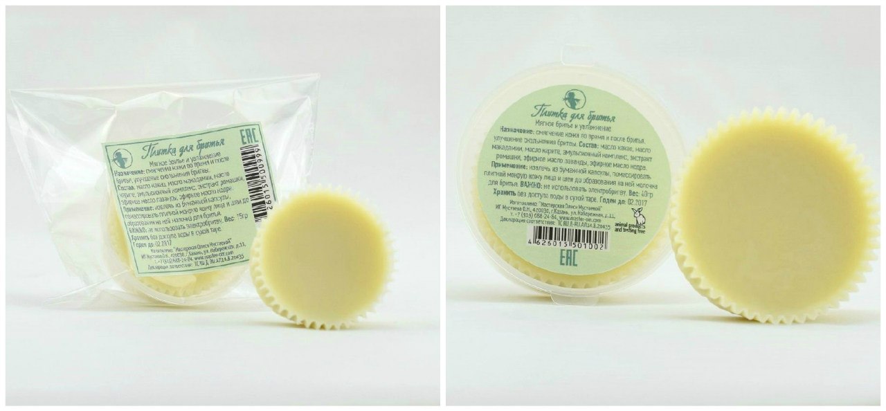 Применение: помассировать плиткой мокрую кожу лица и шеи до образования на ней молочка для бритья. Возможно использование